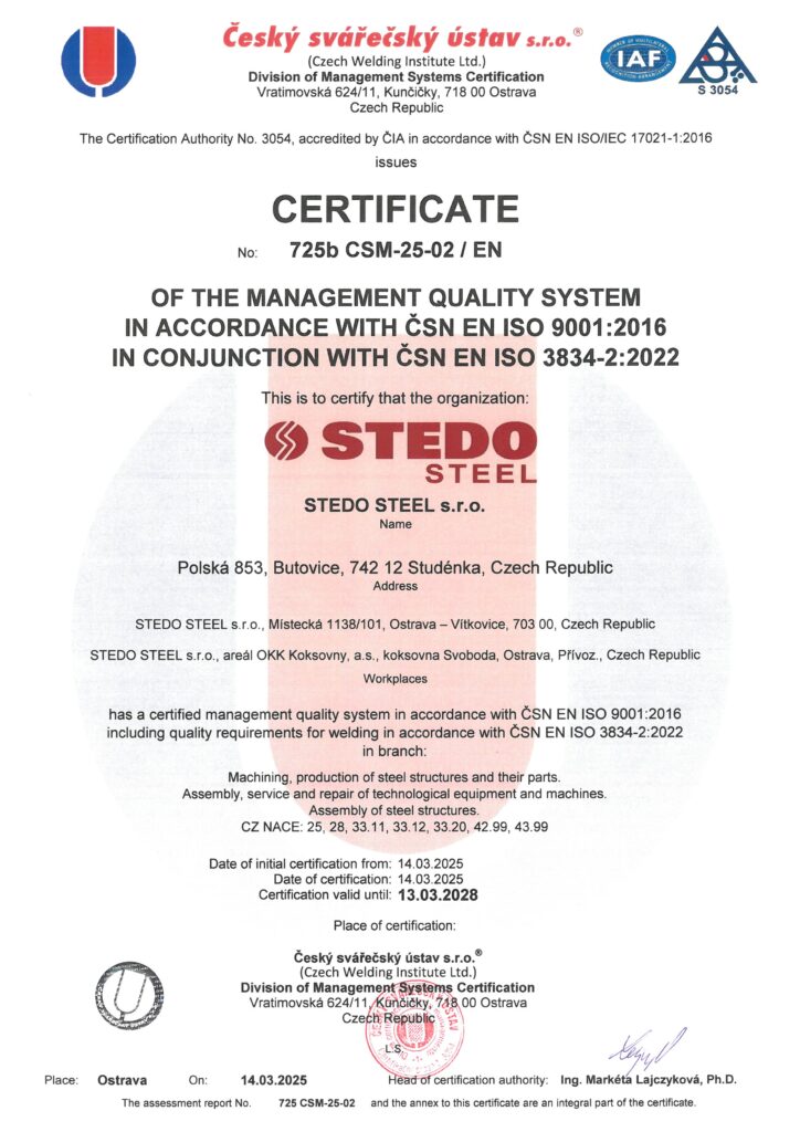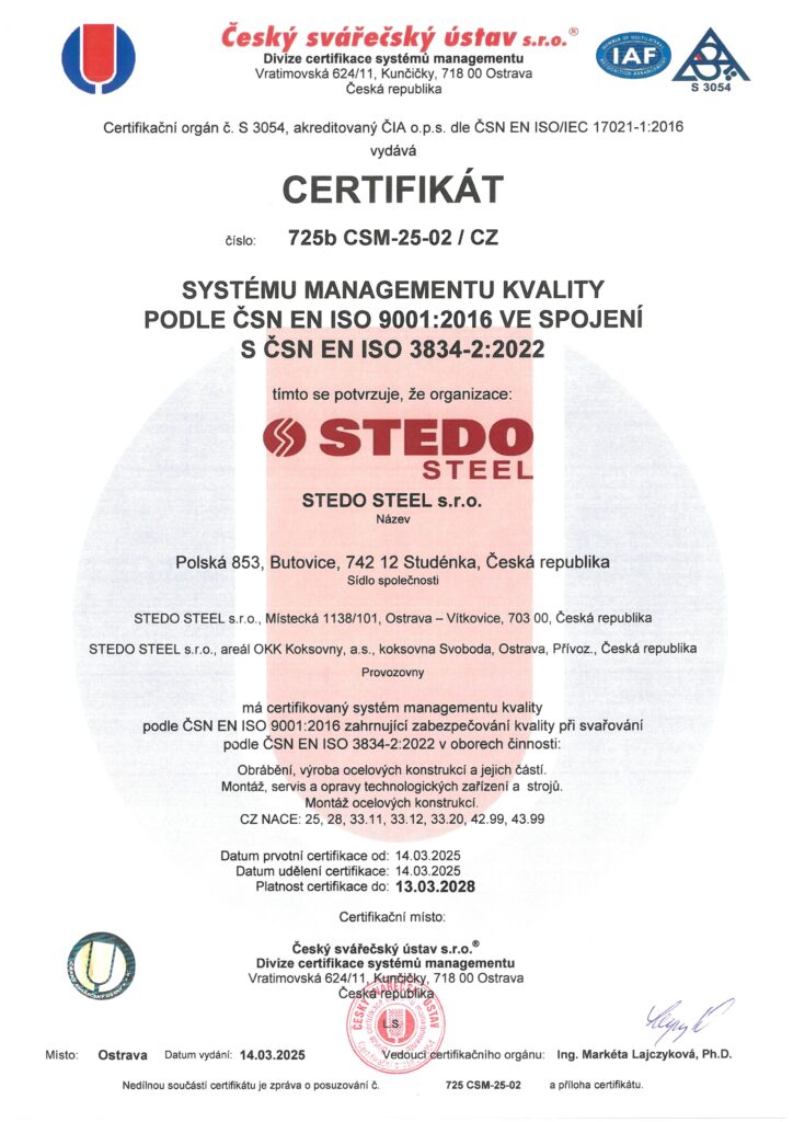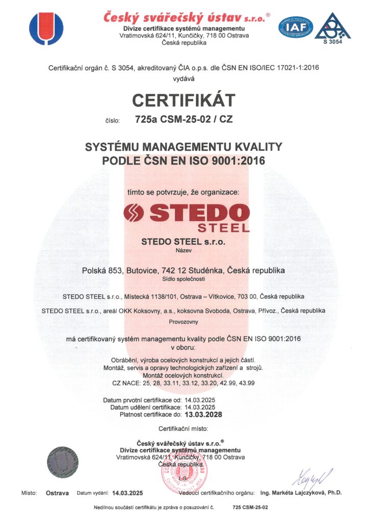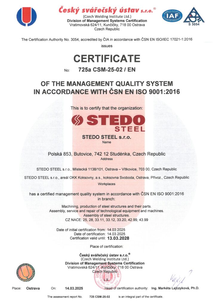 Společnost STEDO STEEL s.r.o. je organizace specializující se na poskytování komplexních služeb jak v oblasti údržby technologických celků, tak ve výrobě a montáži ocelových konstrukcí a strojního zařízení. V současné chvíli společnost působí především v odvětví hutnictví a strojírenství, kde čerpá z dlouholetých zkušeností vedení společnosti.